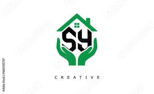 SY Home Care Logo - Green House and Hand Symbol for Real Estate, Eco Housing & Modern Branding