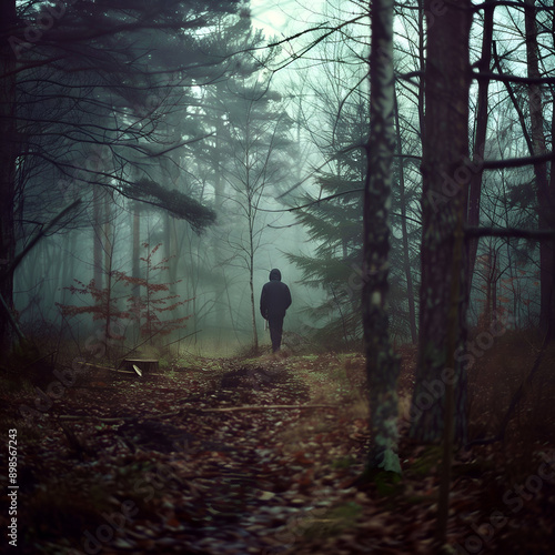 Sylwetka samotnego mężczyzny w zamglonym lesie