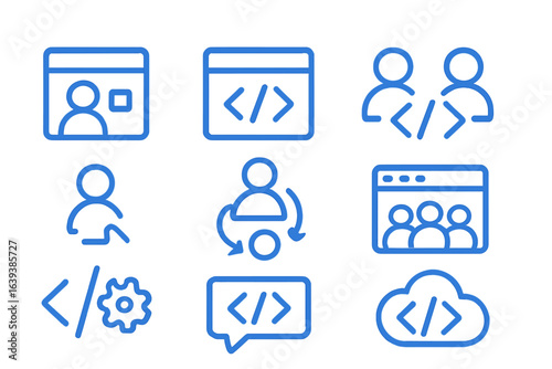 Symbols representing web development activities and collaboration among developers in a digital workspace