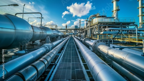 Symmetric view of a large industrial facility with multiple pipelines and cylindrical structures under a clear sky.