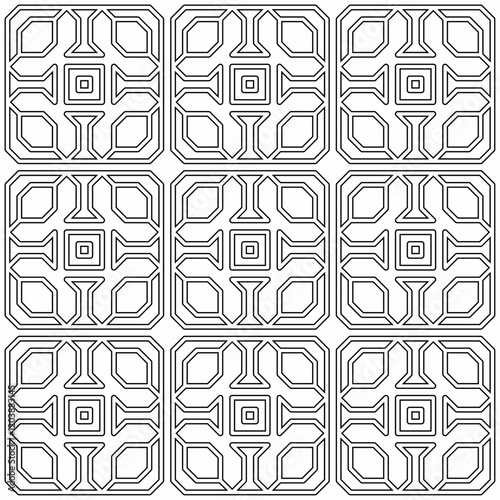 Symmetrical black line art creates a seamless geometric pattern on a white background. Ideal for coloring books, artistic designs, or backgrounds.
