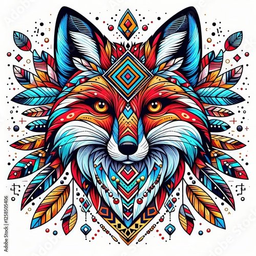 Symmetrical fox portrait displaying vibrant tribal and geometric artistry