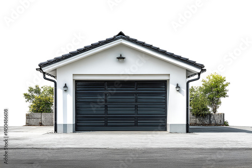 Symmetrical garage with a modern black door and surrounding greenery landscape