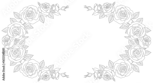 Symmetrical line art illustration of elegant rose floral arrangements forming a decorative border.