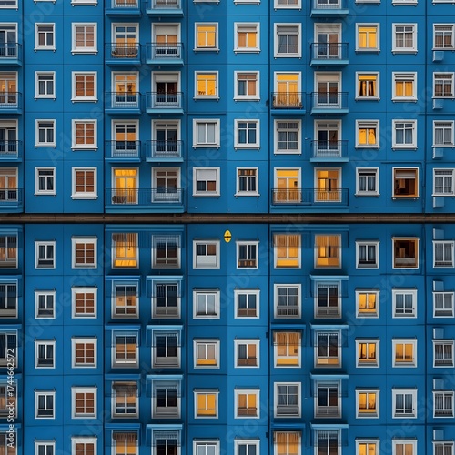 Symmetrical reflection of a blue apartment building with lit windows in calm water, creating a perfect mirrored architectural view that represents balance, geometry, urban lifestyle, and city design a