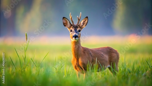 Symmetrical Roe deer grazing in grassland