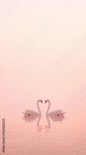 Symmetrical swans create heart reflections on a misty lake at dawn