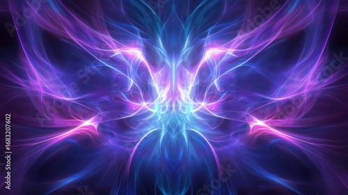 Symmetrical, swirling light patterns in blues, purples and pinks create a mesmerizing abstract design