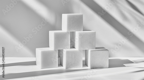 Symmetrically arranged white cubes casting soft shadows on a monochrome minimalist background