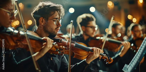 Symphony musicians playing on stage, warm dark light environment, clean background. Generative AI.