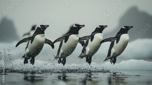 Synchronized splash: A flock of penguins joyfully leaping across icy waters