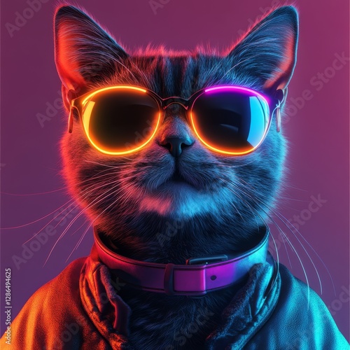 Synthwave cat with sun shades and neon lights white background