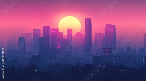 Synthwave city panorama at sunset with vibrant colors and futuristic buildings