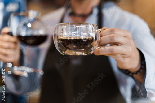 Syphon alternative method of making coffee. Barista gives hot coffee in double glass cup to customers. Coffee brewing in cafe. Scandinavian method of coffee making.