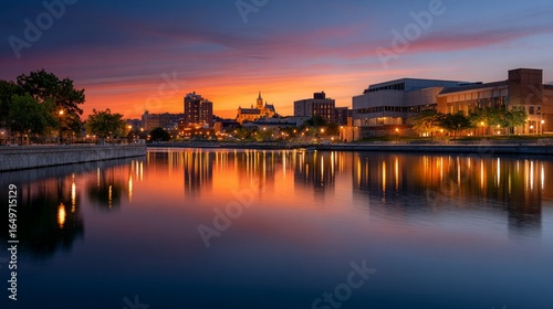 Syracuse skyline with city lights reflecting on the water at twilight