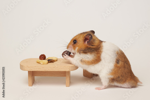 Syrian hamster eat from a table