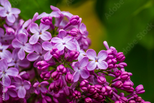 Syringa vulgaris, the lilac or common lilac Blooming purple flowers green background, close up branch Bouquet garden beautiful wallpaper delicate PARFUMS Selective focus cluster smell copy space.