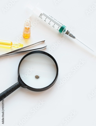 syringe, ampoules with vaccine, tweezer, magnifier glass and dangerous tick on white background. Black legged deer tick, parasite on cats and dogs.