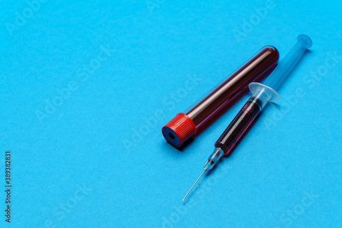 Syringe And Plastic Test Tube With Blood Sample over blue background with copyspace