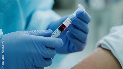 Syringe drawing blood from a patient's arm during a checkup, blood test, health diagnostics.