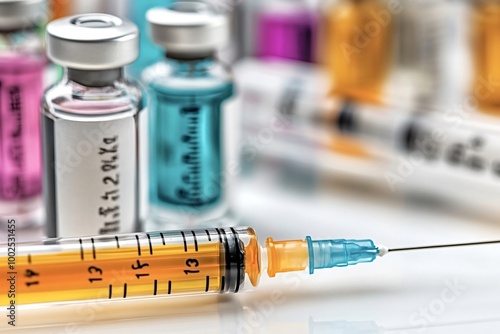 Syringe is laying on a table next to several vials filled with brightly colored medicine, ready to be used for vaccination
