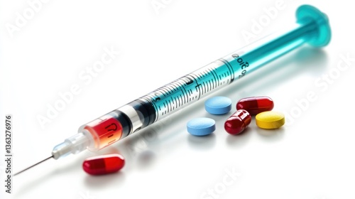 Syringe, pills, medication, healthcare, treatment, white background, medical, pharmaceutical
