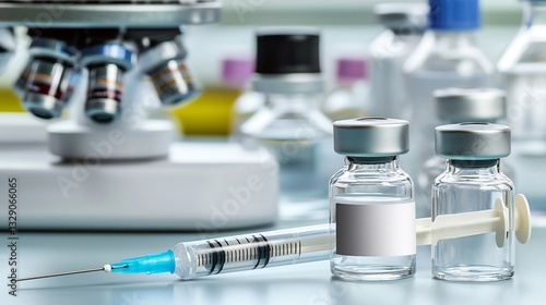 Syringe vial mockup showing a sterile sealed vial with an empty space for branding alongside a medical syringe set on a laboratory background