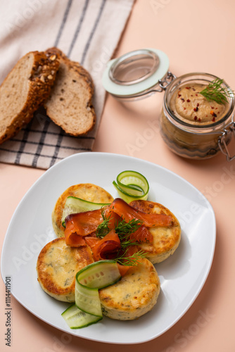 Syrniki (pancakes) with creamy cheese and dill, on plate with fresh cucumber, thinly sliced smoked salmon, and herbs. Jar of homemade pate and fresh bread. Traditional home recipes and gourmet meals.