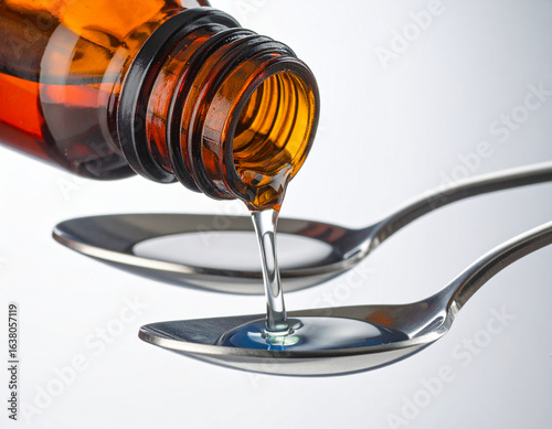 Syrup Pouring from Amber Bottle into Spoons on White Background