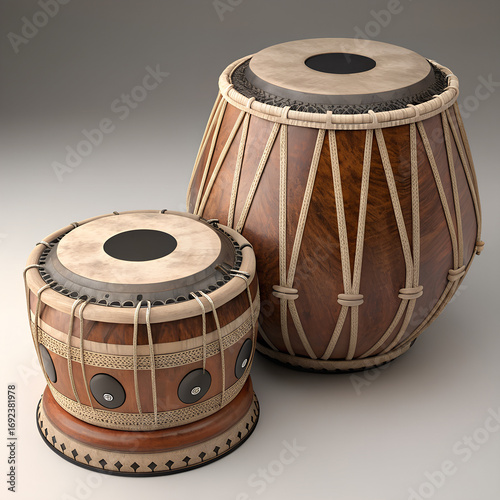 Tabla drums: A pair of meticulously crafted tabla drums sit in a studio setting, the wooden textures and intricate detailing reflecting the rich history and artistry of percussion