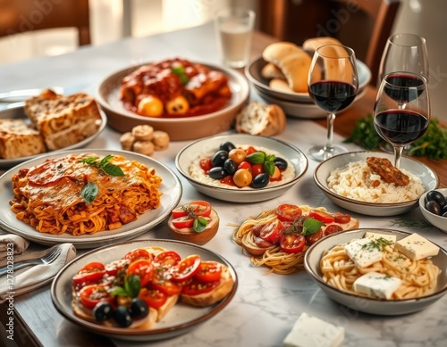 Table Filled with Delicious Italian Cuisine and Red Wine