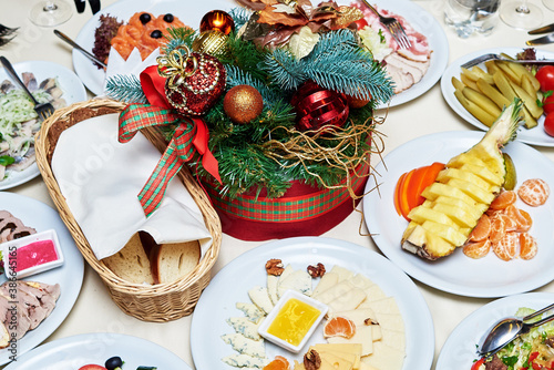 Table setting at Christmas party, copy space. Place setting. Table served for New year banquet in restaurant