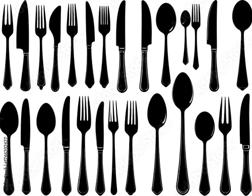 Table setting elements in minimalist line art. Flatware, utensils, knives, forks. Sparse graphic design on dark backdrop