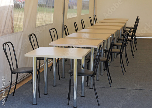 tables and chairs in the dining room in the tent camp.