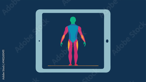 Tablet Display A sleek tablet screen shows a colorful outline of a human body with highlighted areas indicating abnormalities detected by the MRI scan.