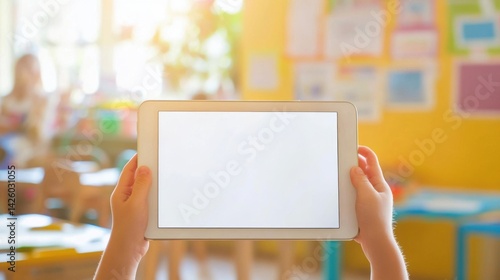 Tablet in child's hand with blank screen. Childs Hands Holding Blank Screen Tablet in Bright Preschool Classroom