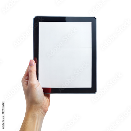 Tablet in Hand – Minimalist Design: A minimalist design featuring a hand holding a tablet with a blank screen, emphasizing simplicity, isolated on a white background.