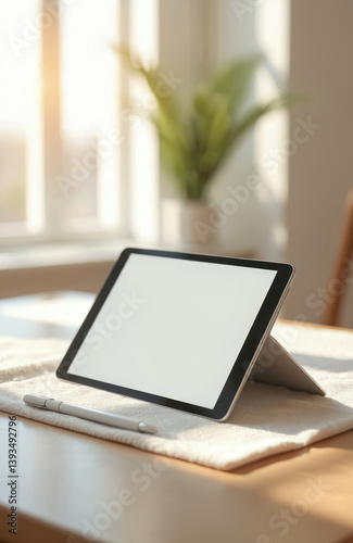 Tablet mockup blank screen table. Natural light. Digital device on table. Workplace, office, home interior. Modern tech concept for presentations, applications. Minimal design. Decor, home details,