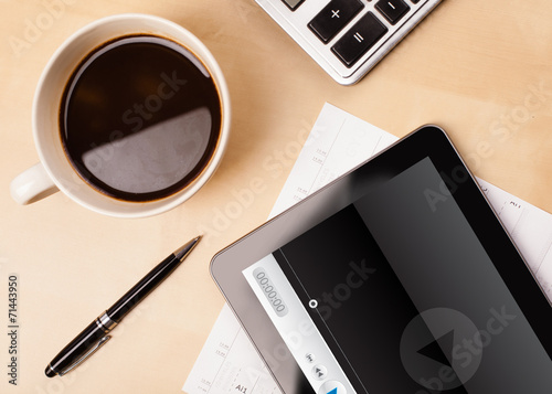 Tablet pc showing media player on screen with a cup of coffee on