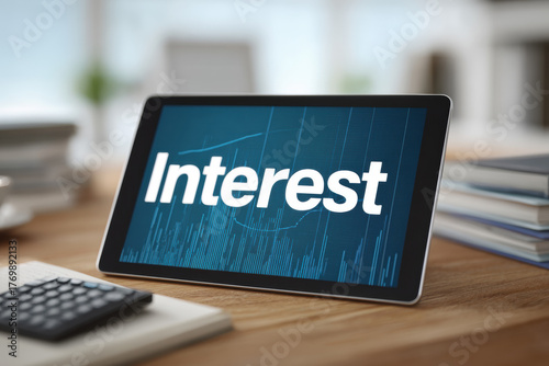 Tablet screen showing the word interest with data charts symbolizing finance, rates, analysis, and economic monitoring.