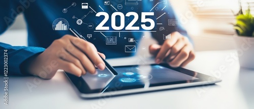 Tablet technology, data analysis, and business strategy in focus for 2025 with professionals exploring market trends, growth opportunities, and financial innovations.