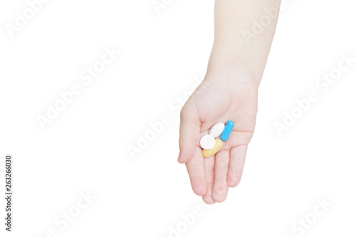 Tablets on a children's palm. Isolate on white background