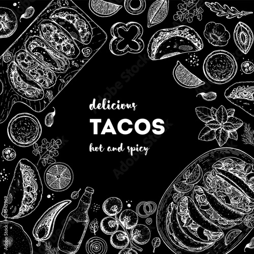 Tacos cooking and ingredients for tacos, sketch illustration. Mexican cuisine frame. Fast food menu design elements. Tacos hand drawn frame. Mexican food