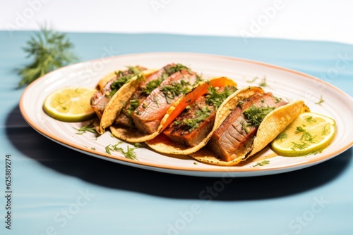 Tacos de Lengua served on a turquoise plate against a white background, focusing on the juicy texture of the beef