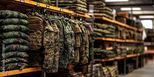Tactical Camouflage Gear Displayed in a Production Facility Warehouse