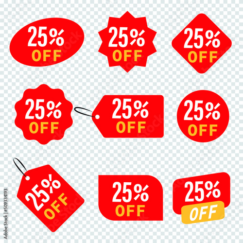 Tags set with 25 percentage discount offer. Vector promotion red labels
