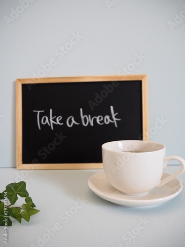 コーヒーの入った白いカップと"Take a break"というメッセージが書かれた黒板