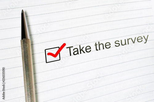 Take survey check box with a pen on lined paper background