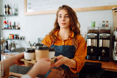 Takeaway food concept. A beautiful female barista gives to-go coffee to a client. Owner of a small business, a coffee shop, behind the bar. Business concept.
