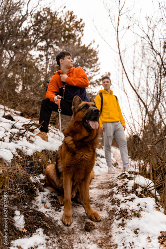 Taking a break with the dog in the forest while smiling and enjoying their time